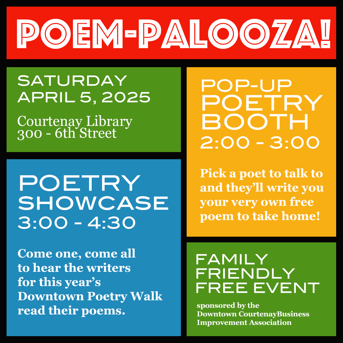 Come celebrate National Poetry Month at the Courtenay Library on Saturday, April 5th at this free, family-friendly event!