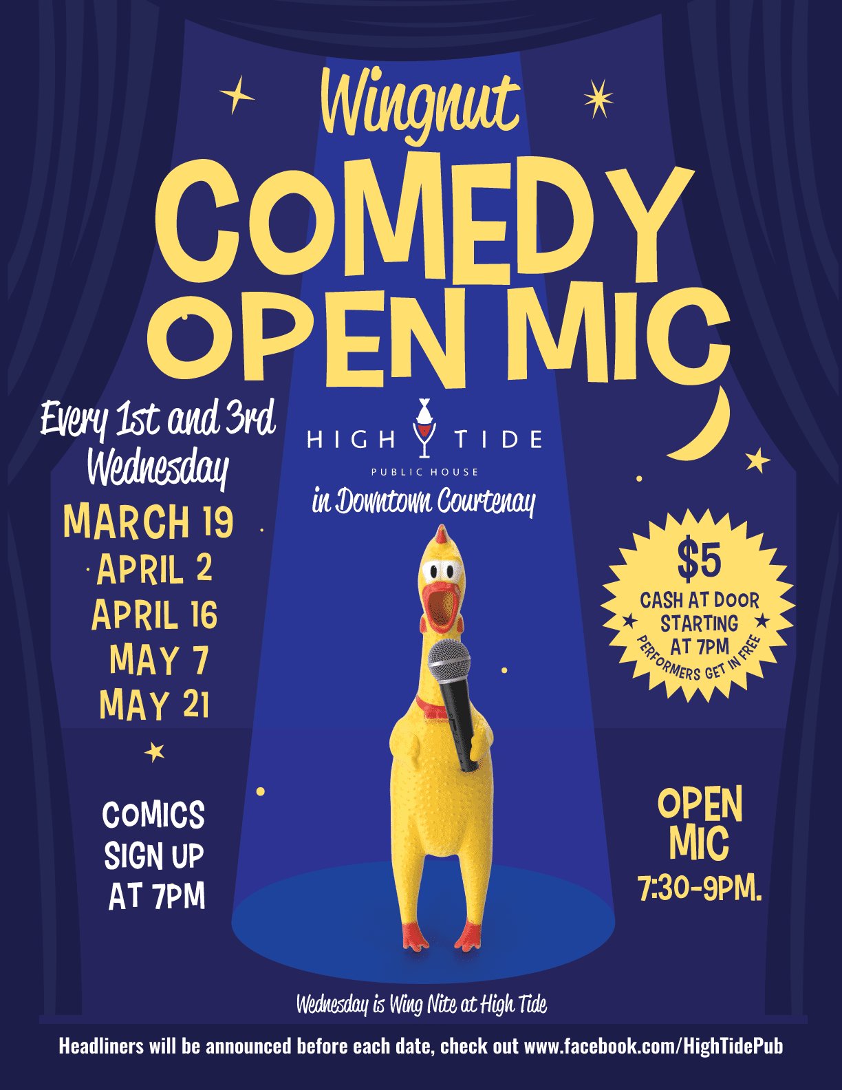 WINGNUT open mic comedy night for local and visiting comedians. Want to try doing standup comedy for the first time? Want to practice your jokes/sets? Check this open mic out! April 2, 16, May 7, 21. At High Tide Pub in Downtown Courtenay. Featuring headliners. Door prizes. Comic sign up at 7pm, show starts at 7:30pm. $5.00 cover charge (used to pay headliners).