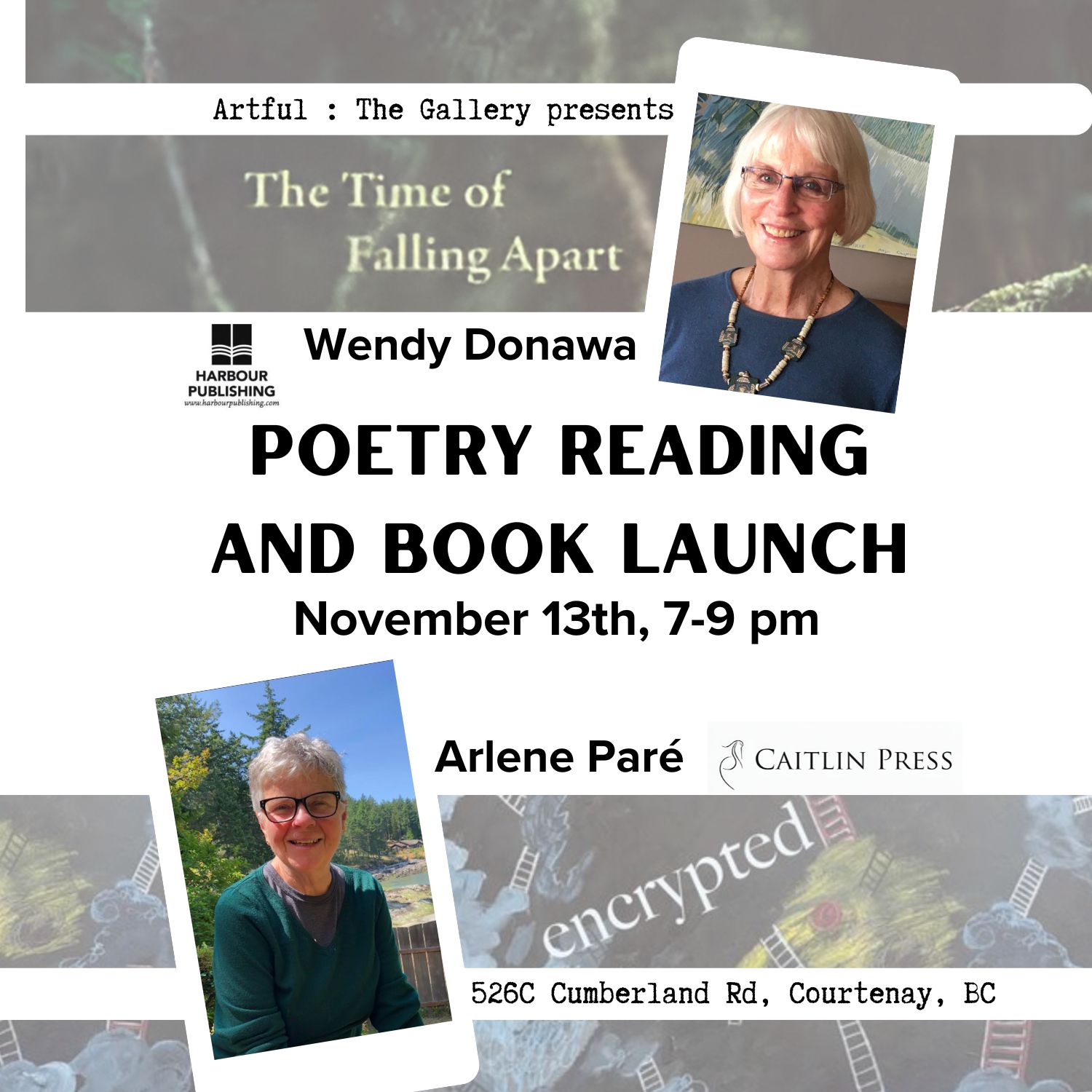 Artful the Gallery 526 Cumberland Rd, Courtenay, BCOn Nov 13, Arleen Paré and Wendy Donawa are hosting a poetry reading as they launch their recently published poetry collections Encrypted (published by Caitlin Press) and The Time of Falling Apart (Harbour Publishing) […]