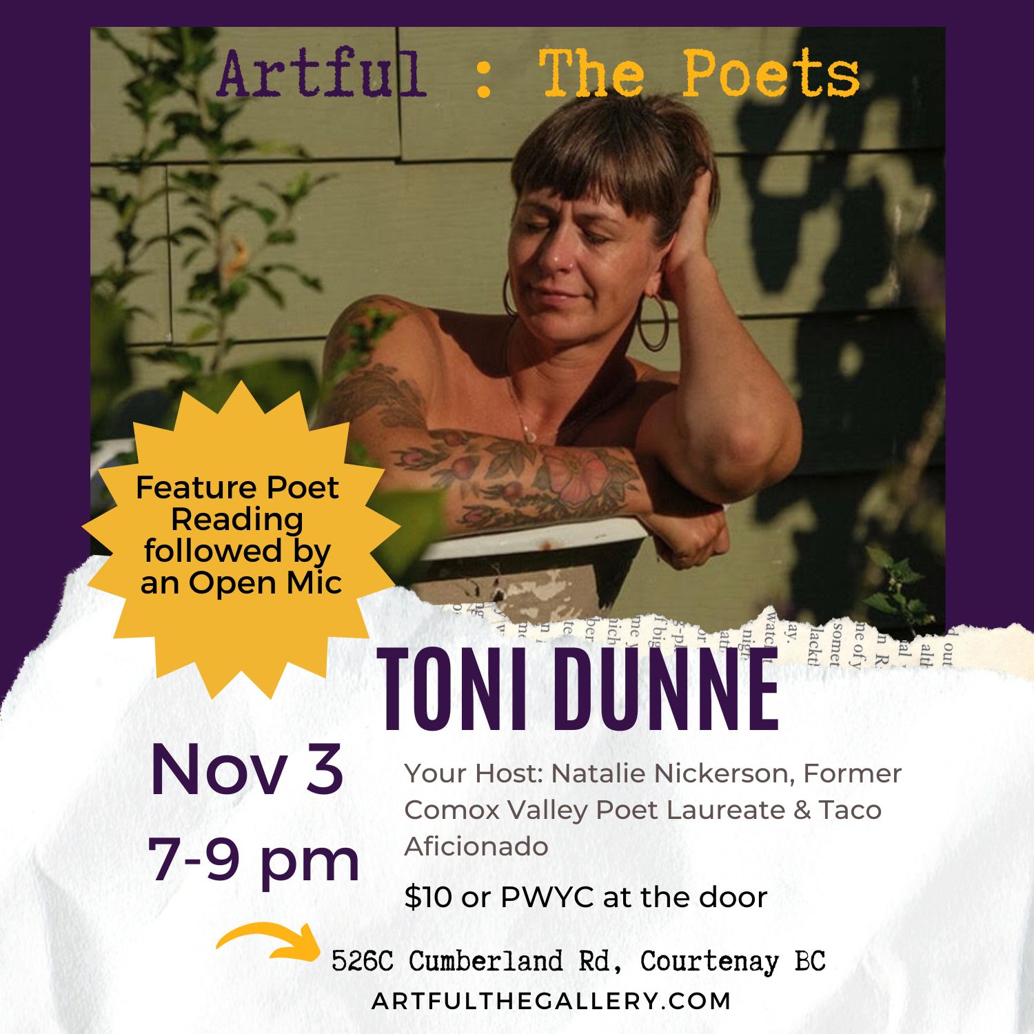 Join host Natalie Nickerson on November 3rd with our feature poet Toni Dunne. Feature poet followed by open mic, sign up at the door (5 mins each spot). Toni Dunne is an earthen creatrix, eco-sensualist, social butterfly, silly goose. Her poetry is inspired by paradox, the stretchy, crunchy, achy beautiful journey of the human condition. […]