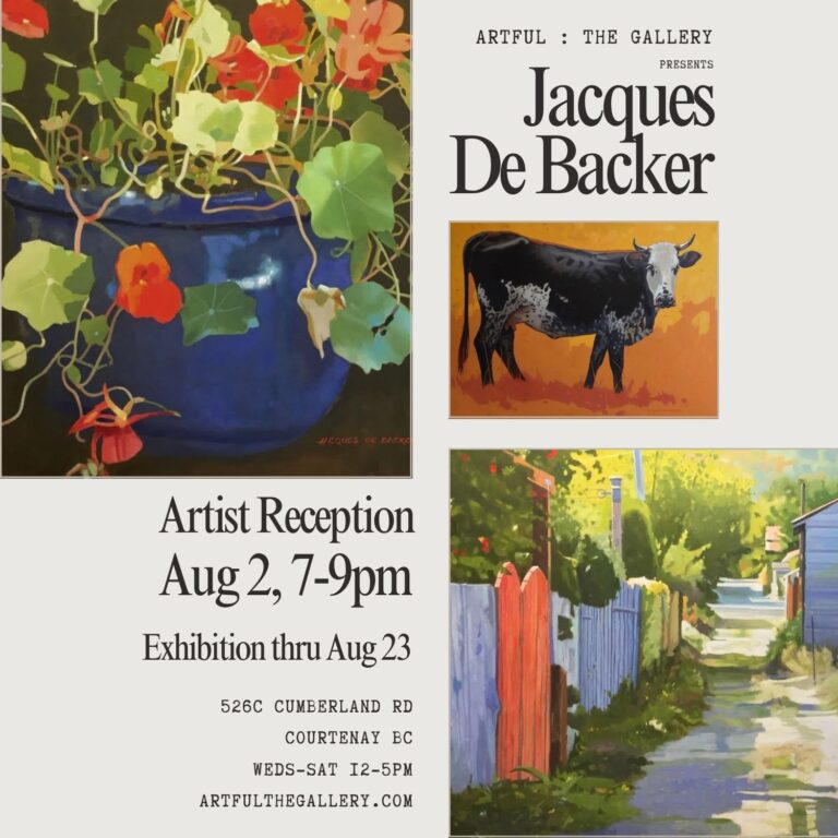 Jacques De Backer has filled the walls at Artful : The Gallery with colour and light through August 23. His iconic Cumberland alleyways, farm scenes and stunning cow portraits are interspersed with his wood sculptures and memories from a life…